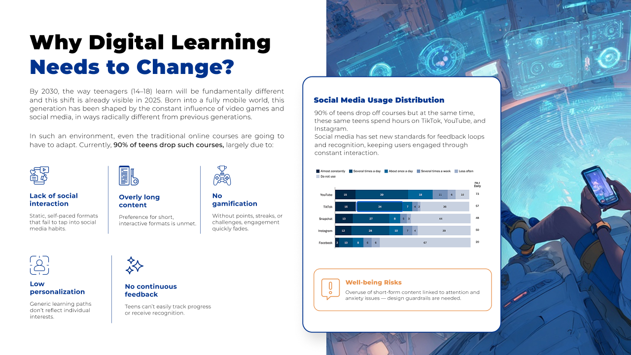 By 2030, the most engaging digital learning platforms will be hybrid, mobile-first, and peer-driven, blending short-form content, social interaction, gamification, personalization, and continuous feedback loops to keep teens motivated and learning.